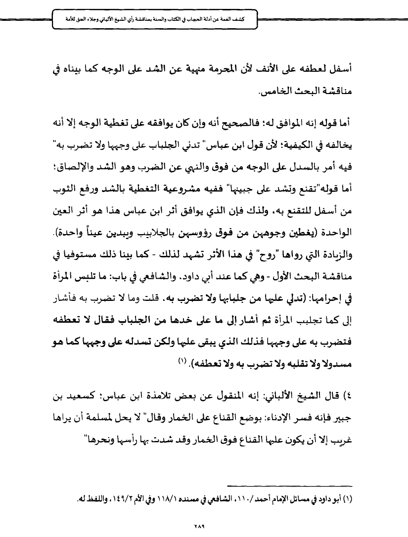 أما قوله إنه الموافق له؛ فالصحيح أنه وإن كان يوافقه على تغطية الوجه إلا أنه يخالفه في الكيفية؛ لأن قول ابن عباس" تدني الجلباب على وجهها ولا تضرب به" فيه أمر بالسدل على الوجه من فوق والنهي عن الضرب وهو الشد والإلصاق؛ أما قوله"تقنع وتشد على جبينها" ففيه مشروعية التغطية بالشد ورفع الثوب من أسفل للتقنع به، ولذك فإن الذي يوافق أثر ابن عباس هذا هو أثر العين الواحدة (يغطين وجوههن من فوق رؤوسهن بالجلابيب ويبدين عيناً واحدة). والزيادة التي رواها "روح" في هذا الأثر تشهد لذلك - كما بينا ذلك مستوفيا في مناقشة البحث الأول - وهي كما عند أبي داود، والشافعي في باب: ما تلبس المرأة في إحرامها: (تدلي عليها من جلبابها ولا تضرب به، قلت وما لا تضرب به فأشار إلى كما تجلبب المرأة ثم أشار إلى ما على خدها من الجلباب فقال لا تعطفه فتضرب به على وجهها فذلك الذي يبقى عليها ولكن تسدله على وجهها كما هو مسدولا ولا تقلبه ولا تضرب به ولا تعطفه). (¬١)