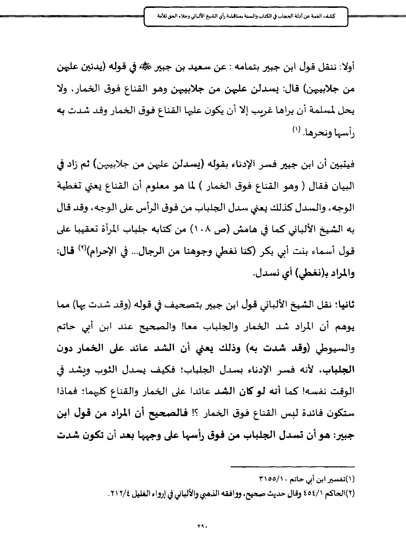 ثانيا؛ نقل الشيخ الألباني قول ابن جبير بتصحيف في قوله (وقد شدت بها) مما يوهم أن المراد شد الخمار والجلباب معا! والصحيح عند ابن أبي حاتم والسيوطي (وقد شدت به) وذلك يعني أن الشد عائد على الخمار دون الجلباب، لأنه فسر الإدناء بسدل الجلباب؛ فكيف يسدل الثوب ويشد في الوقت نفسه! كما أنه لو كان الشد عائدا على الخمار والقناع كليهما؛ فماذا ستكون فائدة لبس القناع فوق الخمار؟! فالصحيح أن المراد من قول ابن جبير: هو أن تسدل الجلباب من فوق رأسها على وجهها بعد أن تكون شدت