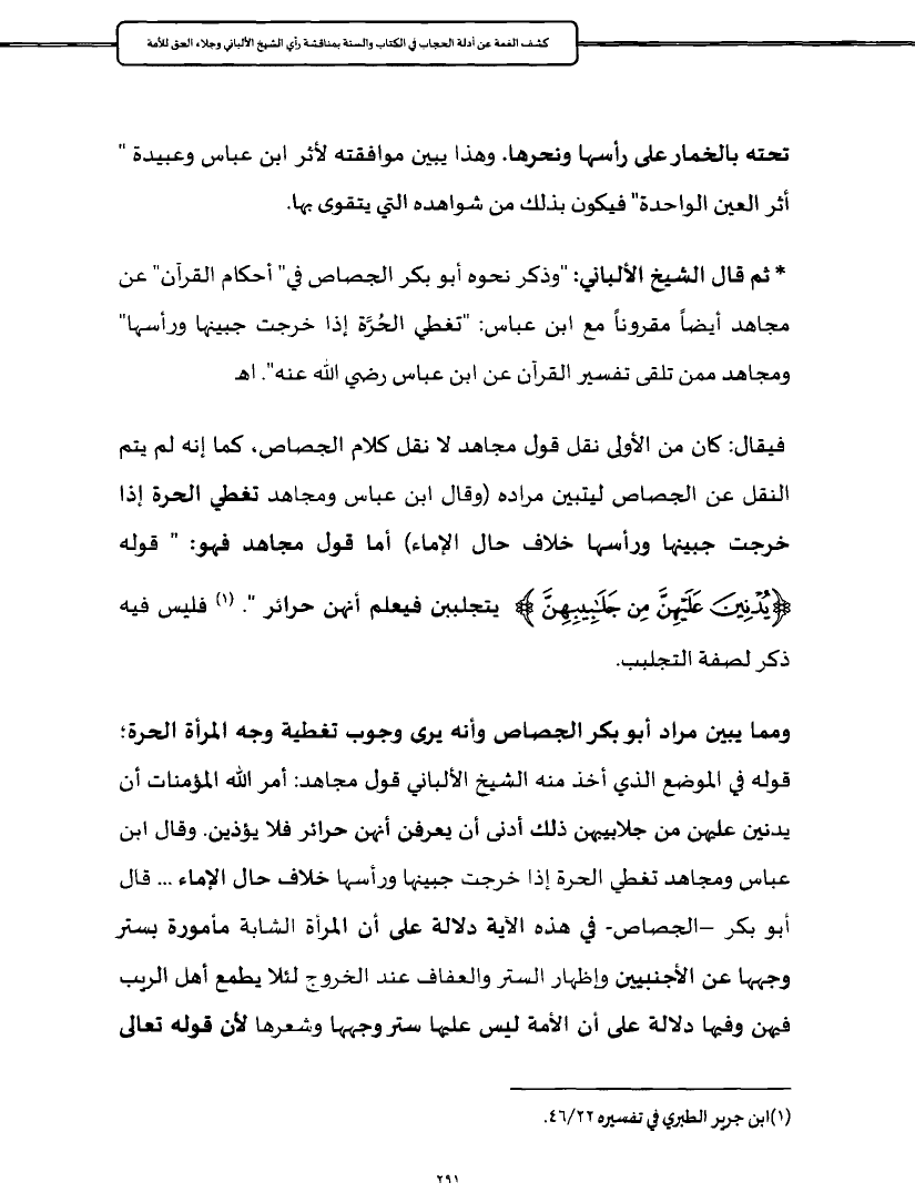 ومما يبين مراد أبو بكر الجصاص وأنه يرى وجوب تغطية وجه المرأة الحرة؛ قوله في الموضع الذي أخذ منه الشيخ الألباني قول مجاهد: أمر الله المؤمنات أن يدنين عليهن من جلابيبهن ذلك أدنى أن يعرفن أنهن حرائر فلا يؤذين. وقال ابن عباس ومجاهد تغطي الحرة إذا خرجت جبينها ورأسها خلاف حال الإماء ... قال أبو بكر -الجصاص- في هذه الآية دلالة على أن المرأة الشابة مأمورة بستر وجهها عن الأجنبيين وإظهار الستر والعفاف عند الخروج لئلا يطمع أهل الريب فيهن وفيها دلالة على أن الأمة ليس عليها ستر وجهها وشعرها لأن قوله تعالى