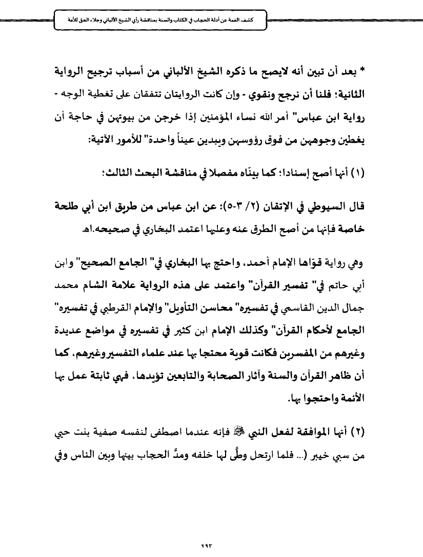 * بعد أن تبين أنه لايصح ما ذكره الشيخ الألباني من أسباب ترجيح الرواية الثانية؛ فلنا أن نرجح ونقوي - وإن كانت الروايتان تتفقان على تغطية الوجه - رواية ابن عباس" أمر الله نساء المؤمنين إذا خرجن من بيوتهن في حاجة أن يغطين وجوههن من فوق رؤوسهن ويبدين عيناً واحدة" للأمور الآتية: