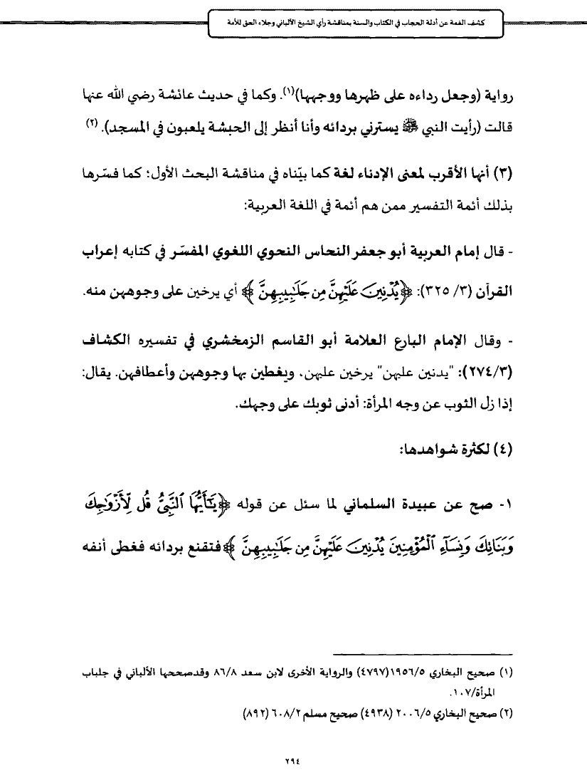 - وقال الإمام البارع العلامة أبو القاسم الزمخشري في تفسيره الكشاف (٣/ ٢٧٤): "يدنين عليهن" يرخين عليهن، ويغطين بها وجوههن وأعطافهن. يقال: إذا زل الثوب عن وجه المرأة: أدنى ثوبك على وجهك.