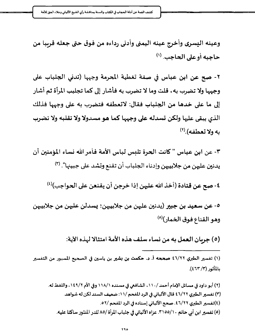 (¬٥) تفسير ابن أبي حاتم ١٠/ ٣١٥٥. عزاه الألباني في جلباب المرأة /٨٥ للدر المنثور ساكتا عليه.