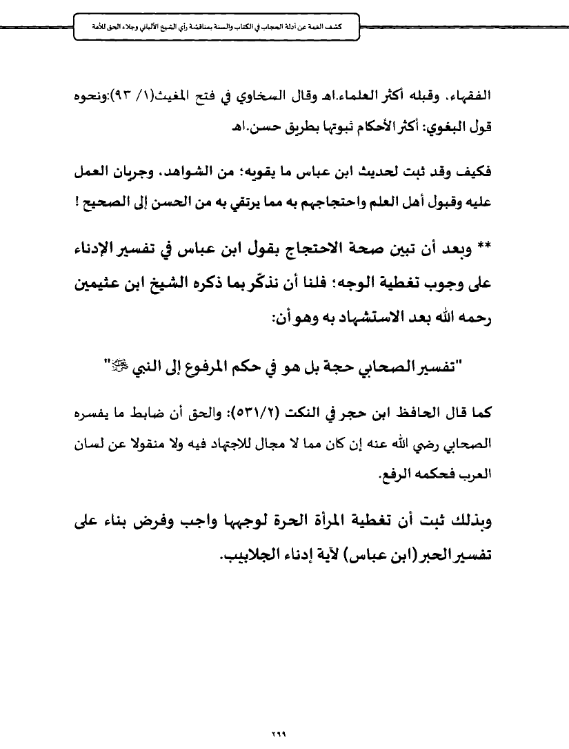 * وبعد أن تبين صحة الاحتجاج بقول ابن عباس في تفسير الإدناء على وجوب تغطية الوجه؛ فلنا أن نذكّر بما ذكره الشيخ ابن عثيمين رحمه الله بعد الاستشهاد به وهو أن: