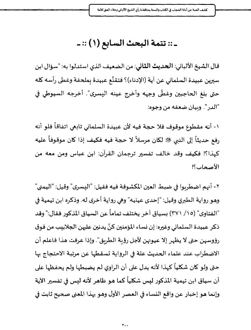 قال الشيخ الألباني: الحديث الثاني: من الضعيف الذي استدلوا به: "سؤال ابن سيرين عبيدة السلماني عن آية (الإدناء)؟ فتقنَّع عبيدة بِملحفة وغطى رأسه كله حتى بلغ الحاجبين وغطّى وجهه وأخرج عينه اليسرى". أخرجه السيوطي في "الدر". وبيان ضعفه من وجوه: