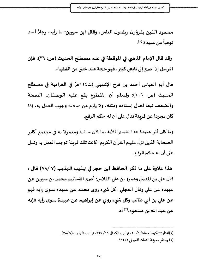 هذا علاوة على ما ذكر الحافظ ابن حجر في تهذيب التهذيب (٧/ ٧٨) قال: قال علي بن المديني وعمرو بن علي الفلاس: أصح الأسانيد محمد بن سيرين عن عبيدة عن علي وقال العجلي: كل شيء روى محمد عن عبيدة سوى رأيه فهو عن علي بن أبي طالب وكل شيء روي عن إبراهيم عن عبيدة سوى رأيه فإنه عن عبد الله بن مسعود. (¬٢) اهـ