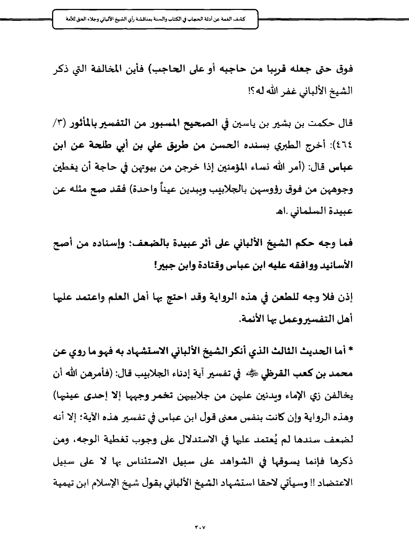 * أما الحديث الثالث الذي أنكر الشيخ الألباني الاستشهاد به فهو ما روي عن محمد بن كعب القرظي - رضي الله عنه - في تفسير آية إدناء الجلابيب قال: (فأمرهن الله أن يخالفن زي الإماء ويدنين عليهن من جلابيبهن تخمر وجهها إلا إحدى عينيها) وهذه الرواية وإن كانت بنفس معنى قول ابن عباس في تفسير هذه الآية؛ إلا أنه لضعف سندها لم يُعتمد