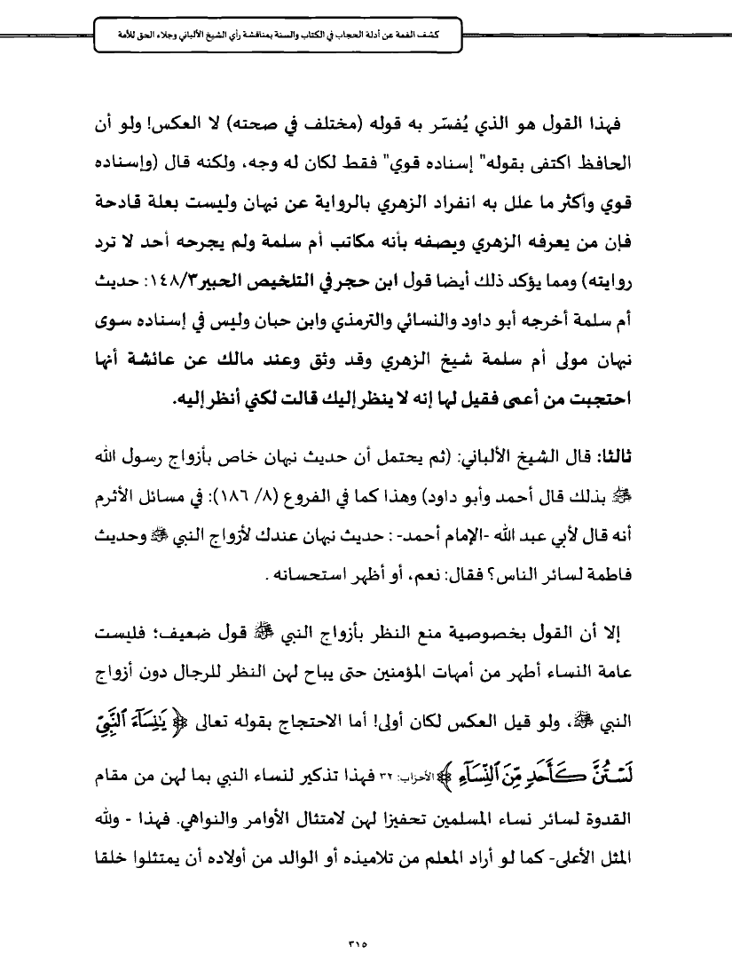 فهذا القول هو الذي يُفسّر به قوله (مختلف في صحته) لا العكس! ولو أن الحافظ اكتفى بقوله" إسناده قوي" فقط لكان له وجه، ولكنه قال (وإسناده قوي وأكثر ما علل به انفراد الزهري بالرواية عن نبهان وليست بعلة قادحة فإن من يعرفه الزهري ويصفه بأنه مكاتب أم سلمة ولم يجرحه أحد لا ترد روايته) ومما يؤكد ذلك أيضا قول ابن حجر في التلخيص الحبير ٣/ ١٤٨: حديث أم سلمة أخرجه أبو داود والنسائي والترمذي وابن حبان وليس في إسناده سوى نبهان مولى أم سلمة شيخ الزهري وقد وثق وعند مالك عن عائشة أنها احتجبت من أعمى فقيل لها إنه لا ينظر إليك قالت لكني أنظر إليه.