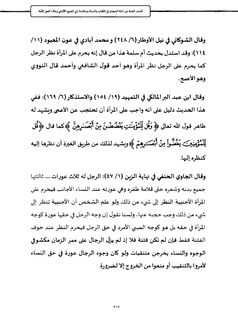 وقال ابن عبد البر المالكي في التمهيد (١٩/ ١٥٤) والاستذكار (٦/ ١٦٩): ففي هذا الحديث دليل على أنه واجب على المرأة أن تحتجب عن الأعمى ويشهد له ظاهر قول الله تعالى {وَقُلْ لِلْمُؤْمِنَاتِ يَغْضُضْنَ مِنْ أَبْصَارِهِنَّ} كما قال {قُلْ لِلْمُؤْمِنِينَ يَغُضُّوا مِنْ أَبْصَارِهِمْ} ويشهد لذلك من طريق الغيرة أن نظرها إليه كنظره إليها.