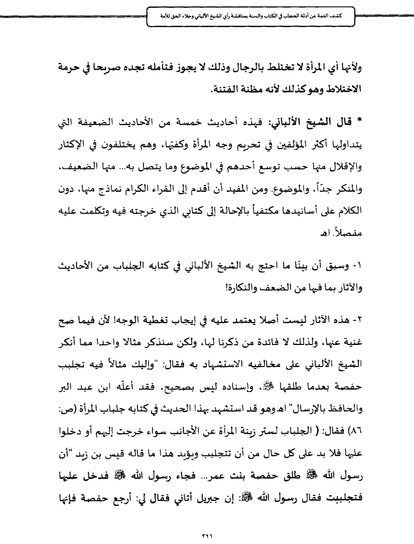 ١ - وسبق أن بينَا ما احتج به الشيخ الألباني في كتابه الجلباب من الأحاديث والآثار بما فيها من الضعف والنكارة!