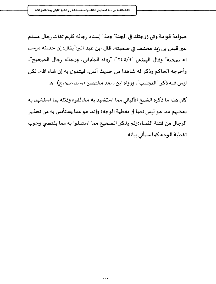 كان هذا ما ذكره الشيخ الألباني مما استشهد به مخالفوه وذيّله بما استشهد به بعضهم مما هو ليس نصا في تغطية الوجه؛ وإنما هو مما يستأنس به من تحذير الرجال من فتنة النساء؛ ولم يذكر الصحيح مما استدلوا به مما يقتضي وجوب تغطية الوجه كما سيأتي بيانه.