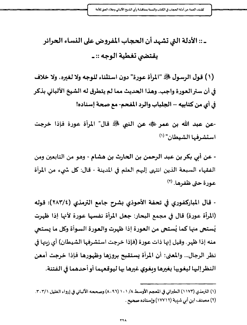(١) قول الرسول - صلى الله عليه وسلم - "المرأة عورة" دون استثناء للوجه ولا لغيره، ولا خلاف في أن ستر العورة واجب. وهذا الحديث مما لم يتطرق له الشيخ الألباني بذكر في أي من كتابيه - الجلباب والرد المفحم- مع صحة إسناده!
