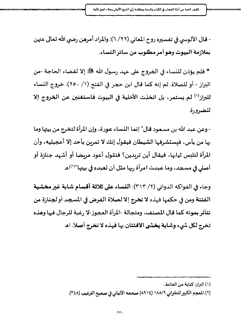 - قال الألوسي في تفسيره روح المعاني (٢٢/ ٦): والمراد أمرهن رضي الله تعالى عنهن بملازمة البيوت وهو أمر مطلوب من سائر النساء.