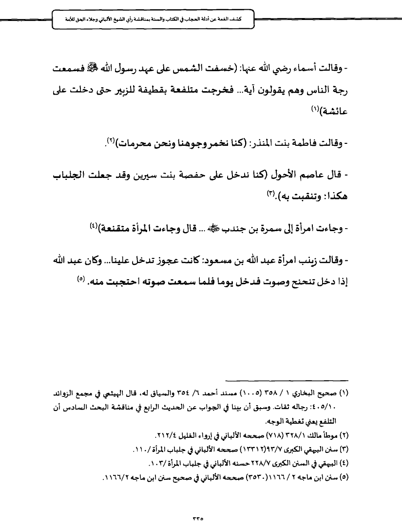 - قال عاصم الأحول (كنا ندخل على حفصة بنت سيرين وقد جعلت الجلباب هكذا؛ وتنقبت به). (¬٣)