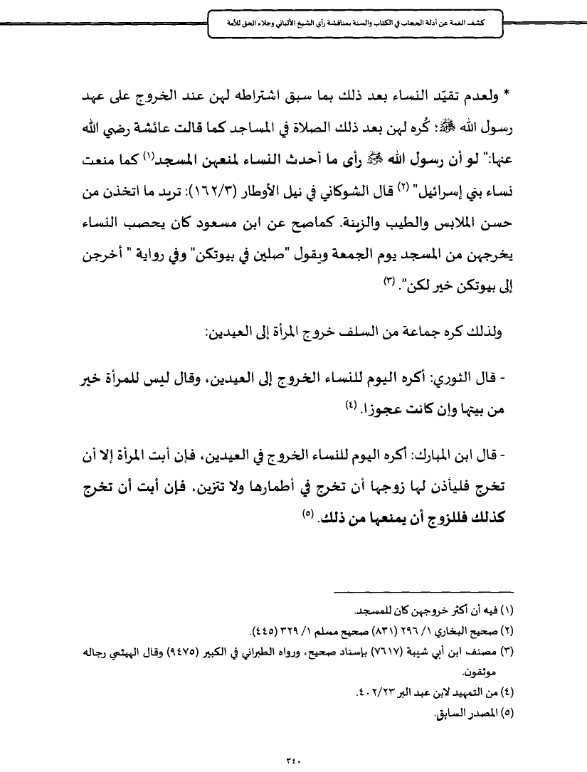 - قال ابن المبارك: أكره اليوم للنساء الخروج في العيدين، فإن أبت المرأة إلا أن تخرج فليأذن لها زوجها أن تخرج في أطمارها ولا تتزين، فإن أبت أن تخرج كذلك فللزوج أن يمنعها من ذلك. (¬٥)