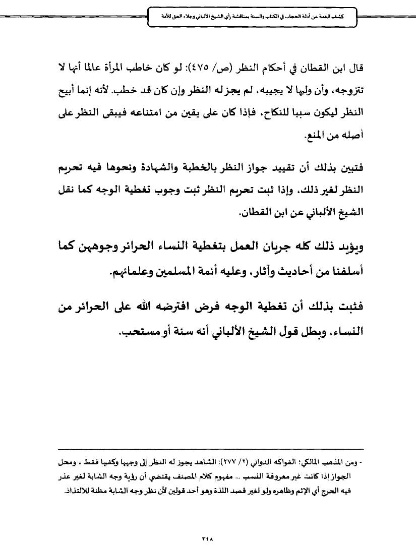 فتبين بذلك أن تقييد جواز النظر بالخطبة والشهادة ونحوها فيه تحريم النظر لغير ذلك، وإذا ثبت تحريم النظر ثبت وجوب تغطية الوجه كما نقل الشيخ الألباني عن ابن القطان.