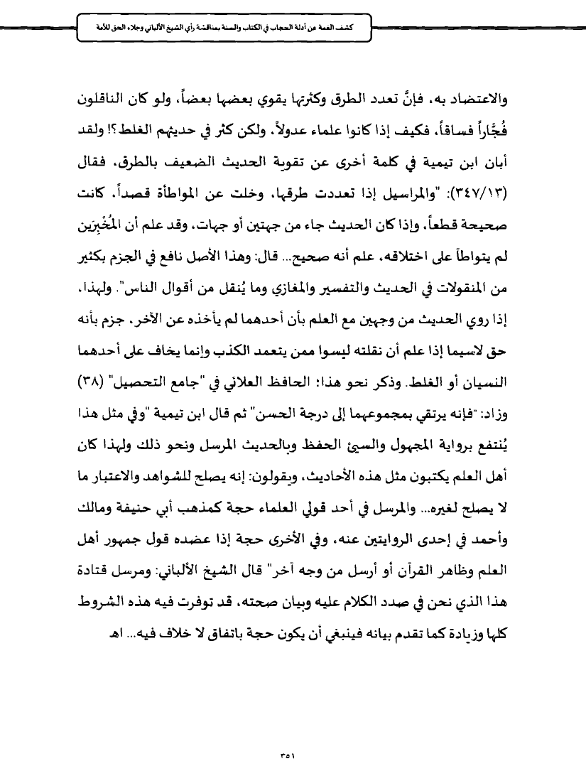 والاعتضاد به، فإنَّ تعدد الطرق وكثرتها يقوي بعضها بعضاً، ولو كان الناقلون فُجَّاراً فساقاً، فكيف إذا كانوا علماء عدولاً، ولكن كثر في حديثهم الغلط؟! ولقد أبان ابن تيمية في كلمة أخرى عن تقوية الحديث الضعيف بالطرق، فقال (١٣/ ٣٤٧): "والمراسيل إذا تعددت طرقها، وخلت عن المواطأة قصداً، كانت صحيحة قطعاً، وإذا كان الحديث جاء من جهتين أو جهات، وقد علم أن المُخْبِرَين لم يتواطآ على اختلاقه، علم أنه صحيح ... قال: وهذا الأصل نافع في الجزم بكثير من المنقولات في الحديث والتفسير والمغازي وما يُنقل من أقوال الناس". ولهذا، إذا روي الحديث من وجهين مع العلم بأن أحدهما لم يأخذه عن الآخر، جزم بأنه حق لاسيما إذا علم أن نقلته ليسوا ممن يتعمد الكذب وإنما يخاف على أحدهما النسيان أو الغلط. وذكر نحو هذا؛ الحافظ العلائي في "جامع التحصيل" (٣٨) وزاد: "فإنه يرتقي بمجموعهما إلى درجة الحسن" ثم قال ابن تيمية "وفي مثل هذا يُنتفع برواية المجهول والسيئ الحفظ وبالحديث المرسل ونحو ذلك ولهذا كان أهل العلم يكتبون مثل هذه الأحاديث، ويقولون: إنه يصلح للشواهد والاعتبار ما لا يصلح لغيره ... والمرسل في أحد قولي العلماء حجة كمذهب أبي حنيفة ومالك وأحمد في إحدى الروايتين عنه، وفي الأخرى حجة إذا عضده قول جمهور أهل العلم وظاهر القرآن أو أرسل من وجه آخر" قال الشيخ الألباني: ومرسل قتادة هذا الذي نحن في صدد الكلام عليه وبيان صحته، قد توفرت فيه هذه الشروط كلها وزيادة كما تقدم بيانه فينبغي أن يكون حجة باتفاق لا خلاف فيه ... اهـ
