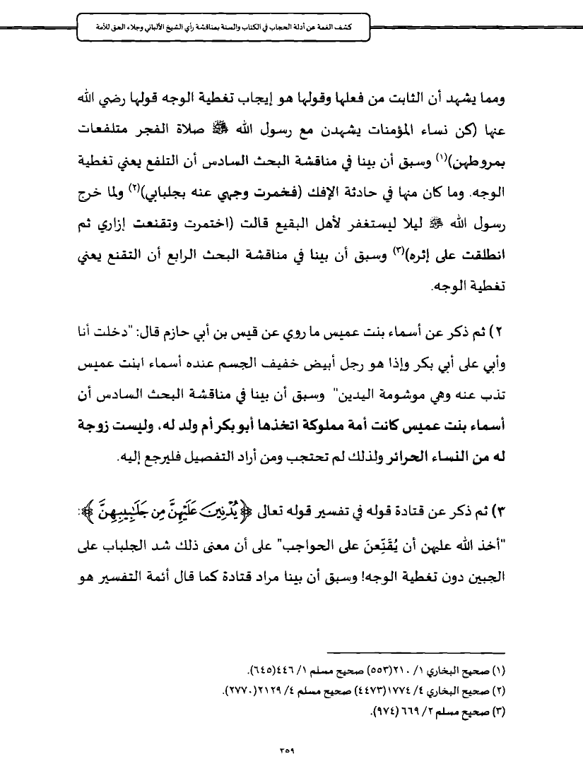 ومما يشهد أن الثابت من فعلها وقولها هو إيجاب تغطية الوجه قولها رضي الله عنها (كن نساء المؤمنات يشهدن مع رسول الله - صلى الله عليه وسلم - صلاة الفجر متلفعات بمروطهن) (¬١) وسبق أن بينا في مناقشة البحث السادس أن التلفع يعني تغطية الوجه. وما كان منها في حادثة الإفك (فخمرت وجهي عنه بجلبابي) (¬٢) ولما خرج رسول الله - صلى الله عليه وسلم - ليلا ليستغفر لأهل البقيع قالت (اختمرت وتقنعت إزاري ثم انطلقت على إثره) (¬٣) وسبق أن بينا في مناقشة البحث الرابع أن التقنع يعني تغطية الوجه.