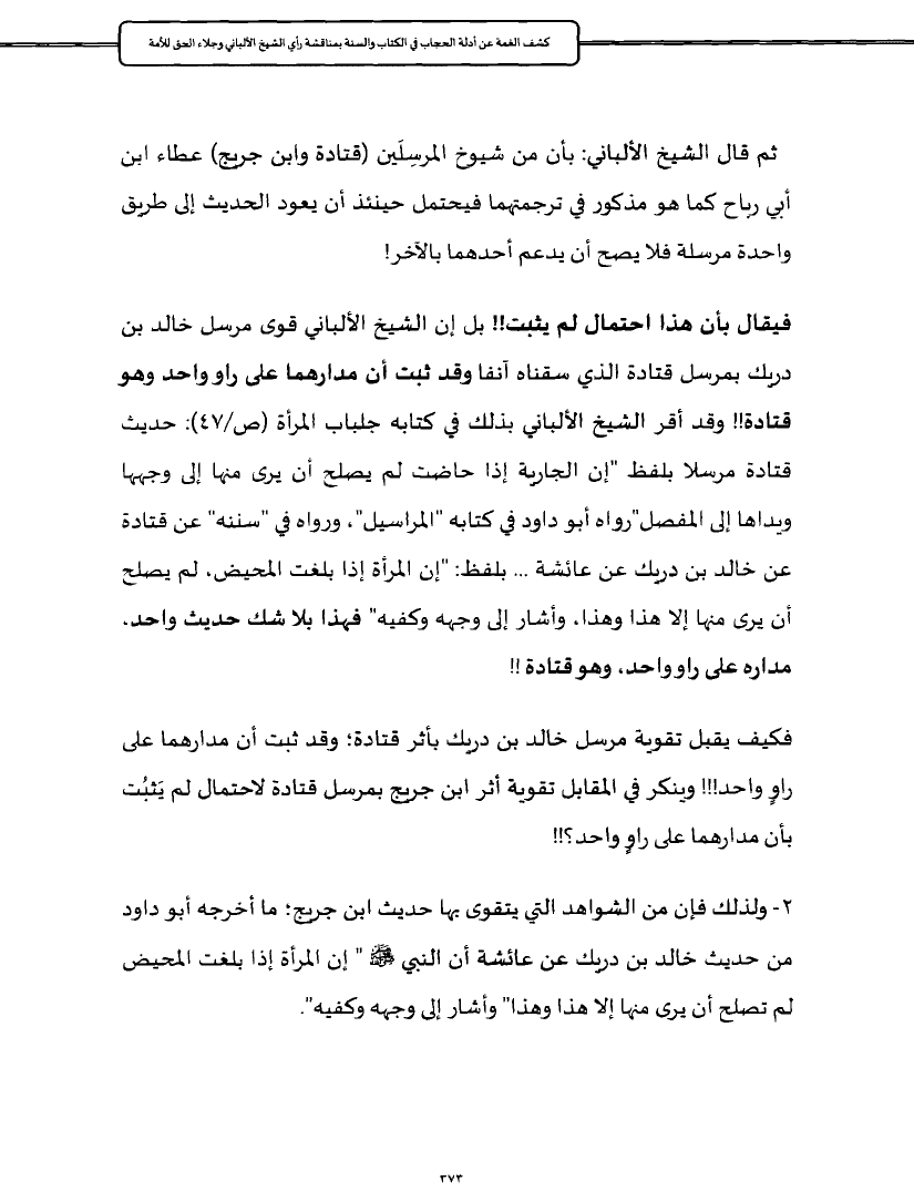 فيقال بأن هذا احتمال لم يثبت!! بل إن الشيخ الألباني قوى مرسل خالد بن دريك بمرسل قتادة الذي سقناه آنفا وقد ثبت أن مدارهما على راو واحد وهو قتادة!! وقد أقر الشيخ الألباني بذلك في كتابه جلباب المرأة (ص/٤٧): حديث قتادة مرسلا بلفظ "إن الجارية إذا حاضت لم يصلح أن يرى منها إلى وجهها ويداها إلى المفصل"رواه أبو داود في كتابه "المراسيل"، ورواه في "سننه" عن قتادة عن خالد بن دريك عن عائشة ... بلفظ: "إن المرأة إذا بلغت المحيض، لم يصلح أن يرى منها إلا هذا وهذا، وأشار إلى وجهه وكفيه" فهذا بلا شك حديث واحد، مداره على راو واحد، وهو قتادة!!