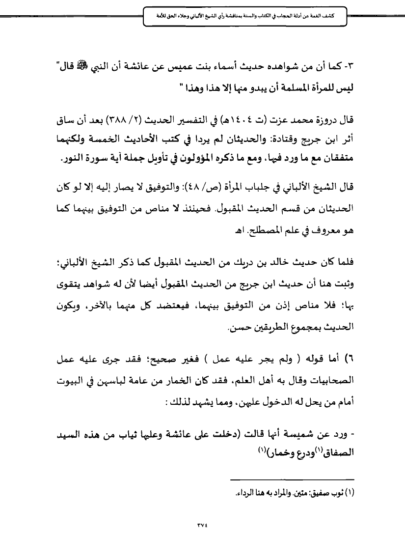 ٦) أما قوله (ولم يجر عليه عمل) فغير صحيح؛ فقد جرى عليه عمل الصحابيات وقال به أهل العلم، فقد كان الخمار من عامة لباسهن في البيوت أمام من يحل له الدخول عليهن، ومما يشهد لذلك: