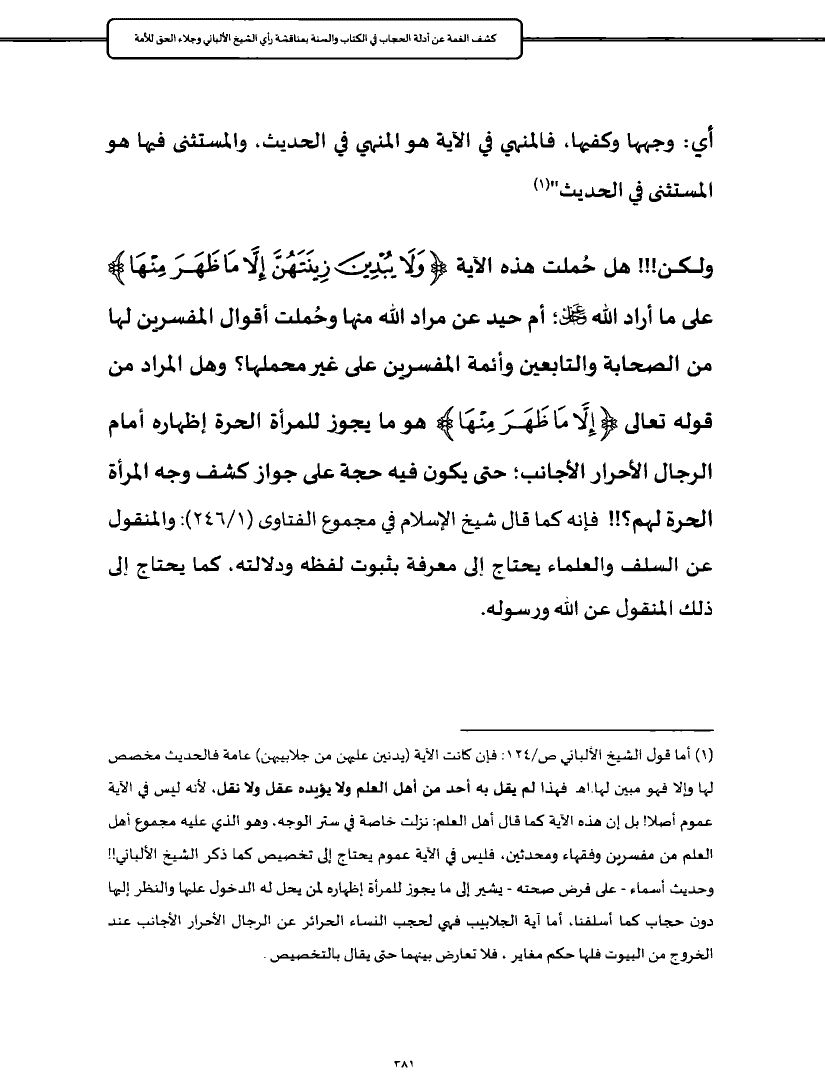(¬١) أما قول الشيخ الألباني ص/١٢٤: فإن كانت الآية (يدنين عليهن من جلابيبهن) عامة فالحديث مخصص لها وإلا فهو مبين لها. اهـ فهذا لم يقل به أحد من أهل العلم ولا يؤيده عقل ولا نقل، لأنه ليس في الآية عموم أصلا! بل إن هذه الآية كما قال أهل العلم: نزلت خاصة في ستر الوجه، وهو الذي عليه مجموع أهل العلم من مفسرين وفقهاء ومحدثين، فليس في الآية عموم يحتاج إلى تخصيص كما ذكر الشيخ الألباني!! وحديث أسماء - على فرض صحته - يشير إلى ما يجوز للمرأة إظهاره لمن يحل له الدخول عليها والنظر إليها دون حجاب كما أسلفنا، أما آية الجلابيب فهي لحجب النساء الحرائر عن الرجال الأحرار الأجانب عند الخروج من البيوت فلها حكم مغاير، فلا تعارض بينهما حتى يقال بالتخصيص.