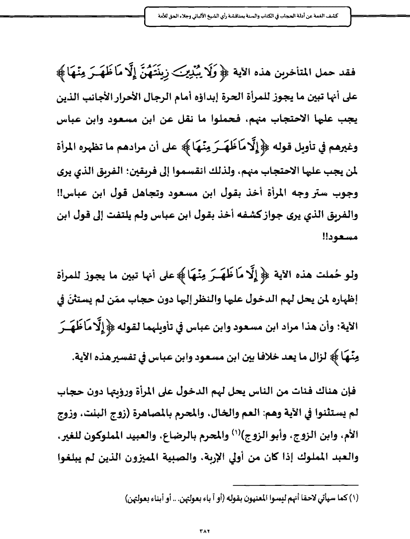 فقد حمل المتأخرين هذه الآية {وَلَا يُبْدِينَ زِينَتَهُنَّ إِلَّا مَا ظَهَرَ مِنْهَا} على أنها تبين ما يجوز للمرأة الحرة إبداؤه أمام الرجال الأحرار الأجانب الذين يجب عليها الاحتجاب منهم، فحملوا ما نقل عن ابن مسعود وابن عباس وغيرهم في تأويل قوله {إِلَّا مَا ظَهَرَ مِنْهَا} على أن مرادهم ما تظهره المرأة لمن يجب عليها الاحتجاب منهم، ولذلك انقسموا إلى فريقين؛ الفريق الذي يرى وجوب ستر وجه المرأة أخذ بقول ابن مسعود وتجاهل قول ابن عباس!! والفريق الذي يرى جواز كشفه أخذ بقول ابن عباس ولم يلتفت إلى قول ابن مسعود!!