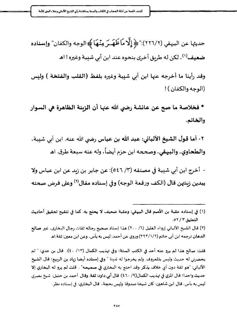 حديثها عن البيهقي (٢/ ٢٢٦): " {إِلَّا مَا ظَهَرَ مِنْهَا} الوجه والكفان" وإسناده ضعيف (¬١)، لكن له طريق أخرى بنحوه عند ابن أبي شيبة وغيره! اهـ