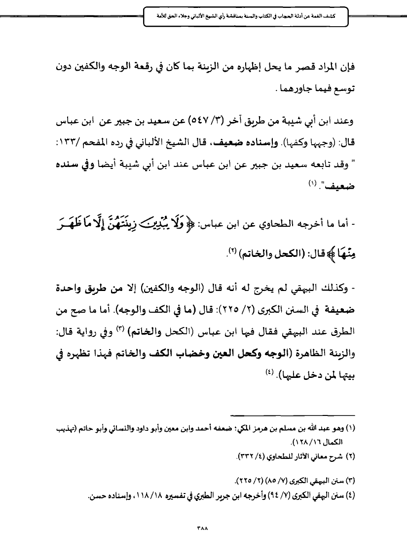وعند ابن أبي شيبة من طريق آخر (٣/ ٥٤٧) عن سعيد بن جبير عن ابن عباس قال: (وجهها وكفها). وإسناده ضعيف، قال الشيخ الألباني في رده المفحم /١٣٣: " وقد تابعه سعيد بن جبير عن ابن عباس عند ابن أبي شيبة أيضا وفي سنده ضعيف". (¬١)