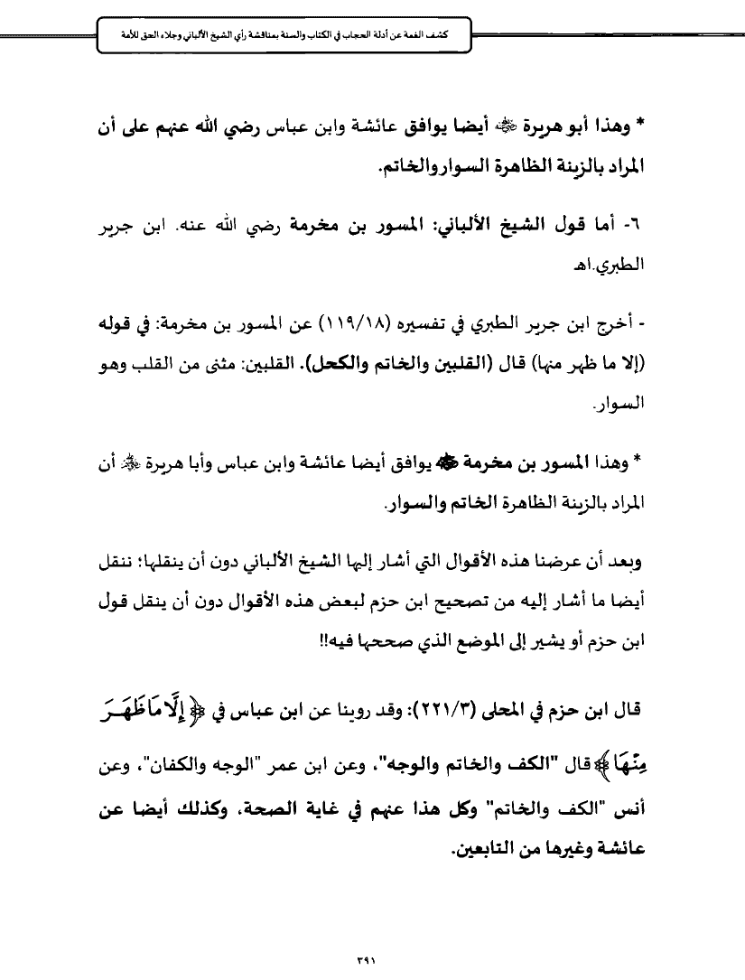 قال ابن حزم في المحلى (٣/ ٢٢١): وقد روينا عن ابن عباس في {إِلَّا مَا ظَهَرَ مِنْهَا} قال "الكف والخاتم والوجه"، وعن ابن عمر "الوجه والكفان"، وعن أنس "الكف والخاتم" وكل هذا عنهم في غاية الصحة، وكذلك أيضا عن عائشة وغيرها من التابعين.