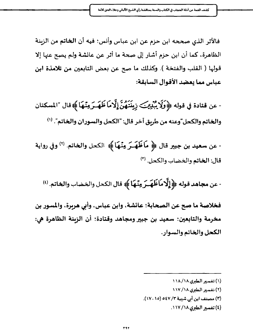 - عن سعيد بن جبير قال {مَا ظَهَرَ مِنْهَا} الكحل والخاتم. (¬٢) وفي رواية قال: الخاتم والخضاب والكحل. (¬٣)