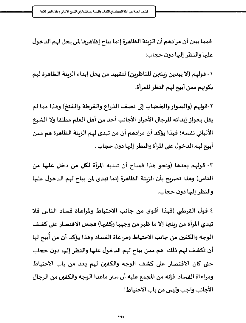 ٤ - قول القرطبي (فهذا أقوى من جانب الاحتياط ولمراعاة فساد الناس فلا تبدي المرأة من زينتها إلا ما ظهر من وجهها وكفيها) فجعل الاقتصار على كشف الوجه والكفين من جانب الاحتياط ومراعاة الفساد وهذا يؤكد أن من أُبيح لها أن تكشف لهم ذلك هم ممن يباح لهم الدخول عليها والنظر إليها دون حجاب حتى كان الاقتصار على كشف الوجه والكفين لهم يعد من باب الاحتياط ومراعاة الفساد. فإنه من المجمع عليه أن ستر ماعدا الوجه والكفين من الرجال الأجانب واجب وليس من باب الاحتياط!