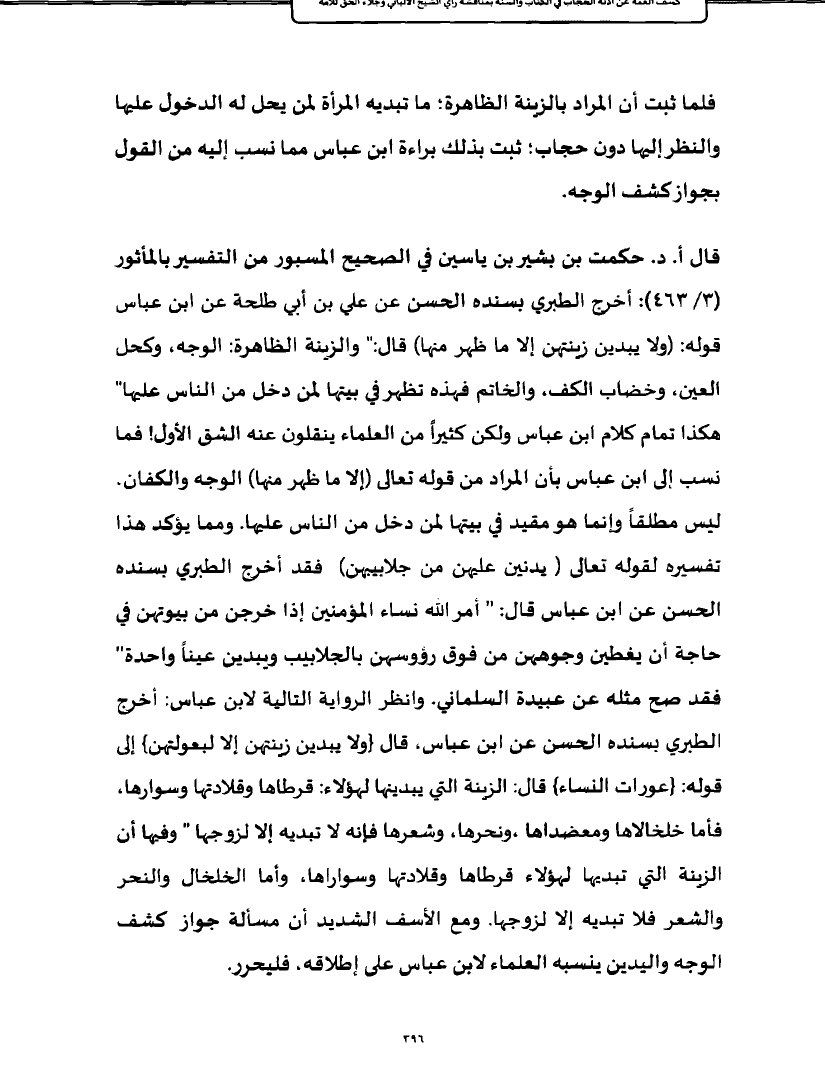 قال أ. د. حكمت بن بشير بن ياسين في الصحيح المسبور من التفسير بالمأثور (٣/ ٤٦٣): أخرج الطبري بسنده الحسن عن علي بن أبي طلحة عن ابن عباس قوله: (ولا يبدين زينتهن إلا ما ظهر منها) قال: " والزينة الظاهرة: الوجه، وكحل العين، وخضاب الكف، والخاتم فهذه تظهر في بيتها لمن دخل من الناس عليها" هكذا تمام كلام ابن عباس ولكن كثيراً من العلماء ينقلون عنه الشق الأول! فما نسب إلى ابن عباس بأن المراد من قوله تعالى (إلا ما ظهر منها) الوجه والكفان، ليس مطلقاً وإنما هو مقيد في بيتها لمن دخل من الناس عليها. ومما يؤكد هذا تفسيره لقوله تعالى (يدنين عليهن من جلابيبهن) فقد أخرج الطبري بسنده الحسن عن ابن عباس قال: " أمر الله نساء المؤمنين إذا خرجن من بيوتهن في حاجة أن يغطين وجوههن من فوق رؤوسهن بالجلابيب ويبدين عيناً واحدة" فقد صح مثله عن عبيدة السلماني. وانظر الرواية التالية لابن عباس: أخرج الطبري بسنده الحسن عن ابن عباس، قال {ولا يبدين زينتهن إلا لبعولتهن} إلى قوله: {عورات النساء} قال: الزينة التي يبدينها لهؤلاء: قرطاها وقلادتها وسوارها، فأما خلخالاها ومعضداها، ونحرها، وشعرها فإنه لا تبديه إلا لزوجها " وفيها أن الزينة التي تبديها لهؤلاء قرطاها وقلادتها وسواراها، وأما الخلخال والنحر والشعر فلا تبديه إلا لزوجها. ومع الأسف الشديد أن مسألة جواز كشف الوجه واليدين ينسبه العلماء لابن عباس على إطلاقه، فليحرر.