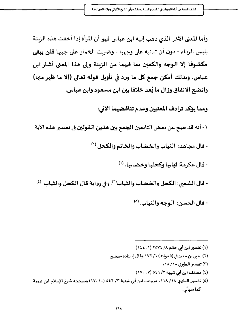 وأما المعنى الآخر الذي ذهب إليه ابن عباس فهو أن المرأة إذا أخفت هذه الزينة بلبس الرداء - دون أن تدنيه على وجهها - وضربت الخمار على جيبها فلن يبقى مكشوفا إلا الوجه والكفين بما فيهما من الزينة وإلى هذا المعنى أشار ابن عباس. وبذلك أمكن جمع كل ما ورد في تأويل قوله تعالى (إلا ما ظهر منها) واتضح الاتفاق وزال ما يُعد خلافا بين ابن مسعود وابن عباس.