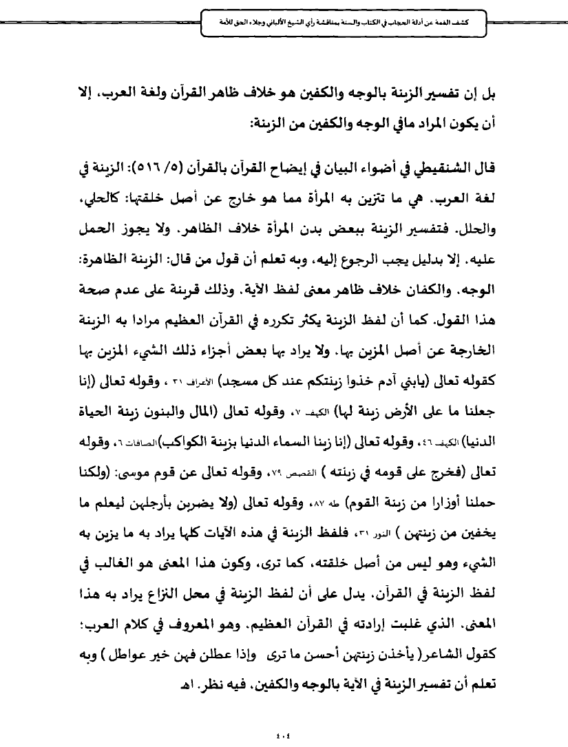 بل إن تفسير الزينة بالوجه والكفين هو خلاف ظاهر القرآن ولغة العرب، إلا أن يكون المراد مافي الوجه والكفين من الزينة: