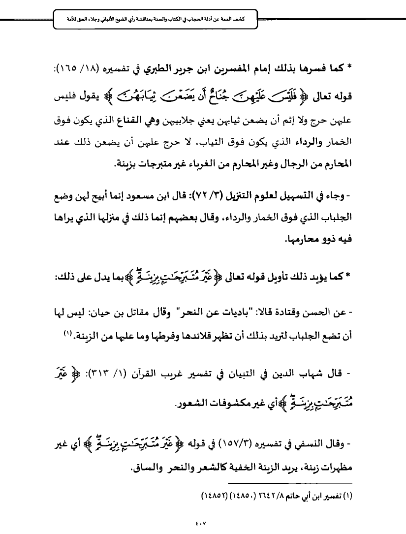- عن الحسن وقتادة قالا: "باديات عن النحر" وقال مقاتل بن حيان: ليس لها أن تضع الجلباب لتريد بذلك أن تظهر قلائدها وقرطها وما عليها من الزينة. (¬١)