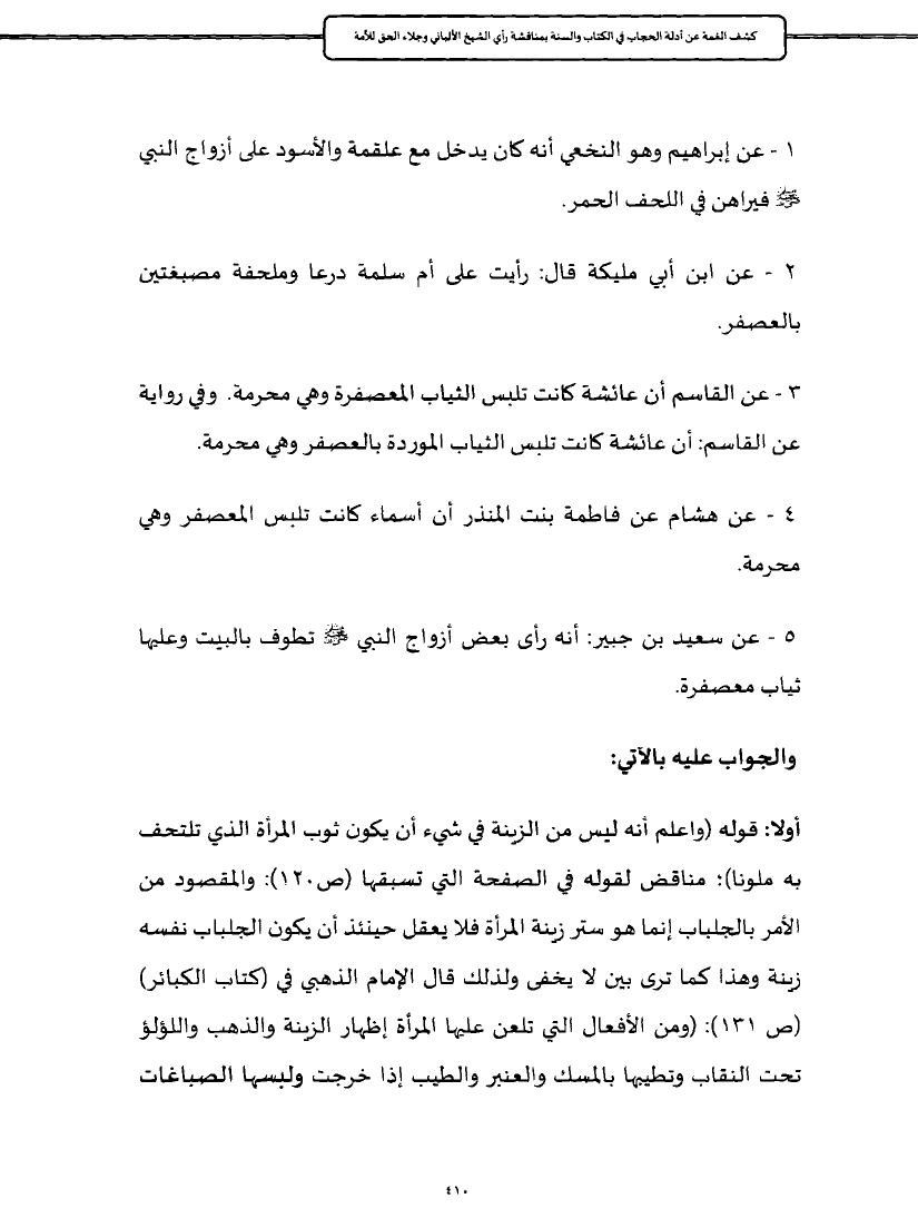 أولا: قوله (واعلم أنه ليس من الزينة في شيء أن يكون ثوب المرأة الذي تلتحف به ملونا)؛ مناقض لقوله في الصفحة التي تسبقها (ص ١٢٠): والمقصود من الأمر بالجلباب إنما هو ستر زينة المرأة فلا يعقل حينئذ أن يكون الجلباب نفسه زينة وهذا كما ترى بين لا يخفى ولذلك قال الإمام الذهبي في (كتاب الكبائر) (ص ١٣١): (ومن الأفعال التي تلعن عليها المرأة إظهار الزينة والذهب واللؤلؤ تحت النقاب وتطيبها بالمسك والعنبر والطيب إذا خرجت ولبسها الصباغات