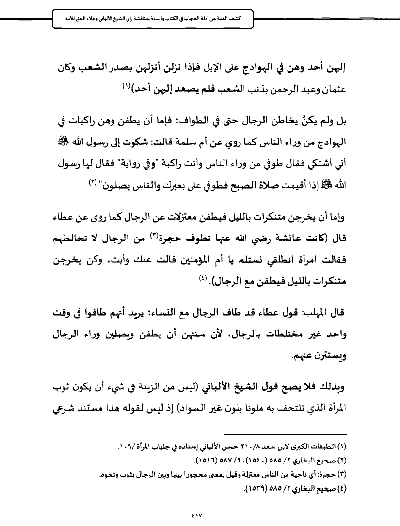وإما أن يخرجن متنكرات بالليل فيطفن معتزلات عن الرجال كما روي عن عطاء قال (كانت عائشة رضي الله عنها تطوف حجرة (¬٣) من الرجال لا تخالطهم فقالت امرأة انطلقي نستلم يا أم المؤمنين قالت عنك وأبت، وكن يخرجن متنكرات بالليل فيطفن مع الرجال). (¬٤)