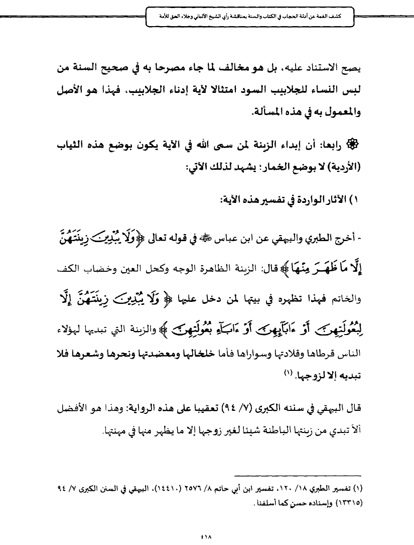 - أخرج الطبري والبيهقي عن ابن عباس - رضي الله عنه - في قوله تعالى {وَلَا يُبْدِينَ زِينَتَهُنَّ إِلَّا مَا ظَهَرَ مِنْهَا} قال: الزينة الظاهرة الوجه وكحل العين وخضاب الكف والخاتم فهذا تظهره في بيتها لمن دخل عليها {وَلَا يُبْدِينَ زِينَتَهُنَّ إِلَّا لِبُعُولَتِهِنَّ أَوْ آبَائِهِنَّ أَوْ آبَاءِ بُعُولَتِهِنَّ} والزينة التي تبديها لهؤلاء الناس قرطاها وقلادتها وسواراها فأما خلخالها ومعضدتها ونحرها وشعرها فلا تبديه إلا لزوجها. (¬١)