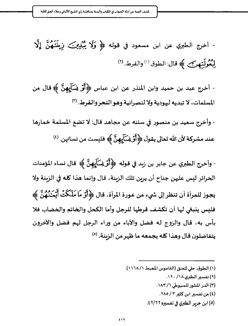 - أخرج الطبري عن ابن مسعود في قوله {وَلَا يُبْدِينَ زِينَتَهُنَّ إِلَّا لِبُعُولَتِهِنَّ} ... قال: الطوق (¬١) والقرط. (¬٢)