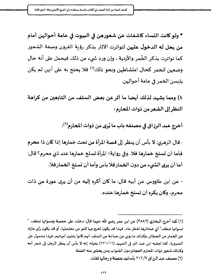 (¬١) كما أخرج البخاري (٣٨٨٢) عن ابن عمر رضي الله عنهما قال: دخلت على حفصة ونسواتها تنطف. " نسواتها تنطف" أي ضفائرها تقطر ماء، فهذا قد يكون لخروجها للتو من مغتسلها، أو قد يكون رأى مازاد عن الخمار من الضفائر. وكذلك ما روي عن جماعة من السلف أنهم كانوا يفلون أمهاتهم، فهذا محمول على الضرورة، كما تعقبه ابن عبد البر في التمهيد (١٦/ ٢٣١) بقوله: إنه لا بأس أن ينظر الرجل إلى شعر أمه وكذلك شعور ذوات المحارم العجائز دون الشواب ومن يخشى منه الفتنة.