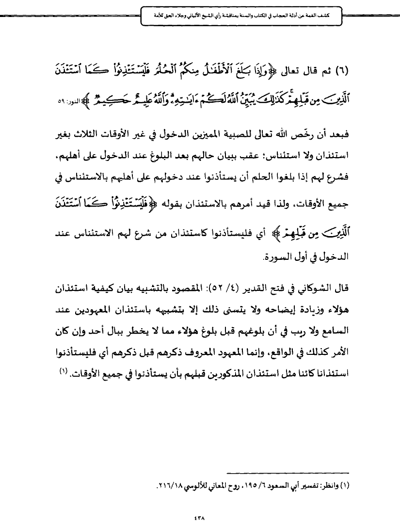 (٦) ثم قال تعالى {وَإِذَا بَلَغَ الْأَطْفَالُ مِنْكُمُ الْحُلُمَ فَلْيَسْتَأْذِنُوا كَمَا اسْتَأْذَنَ الَّذِينَ مِنْ قَبْلِهِمْ كَذَلِكَ يُبَيِّنُ اللَّهُ لَكُمْ آيَاتِهِ وَاللَّهُ عَلِيمٌ حَكِيمٌ} النور: ٥٩