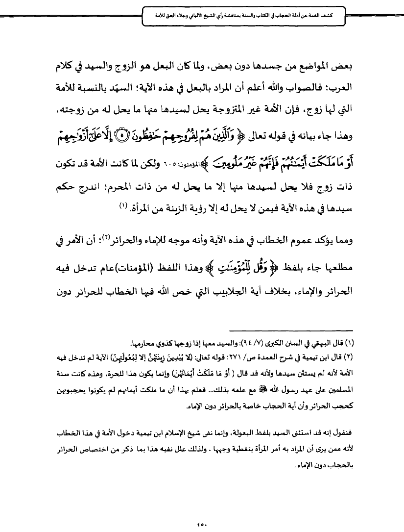 بعض المواضع من جسدها دون بعض، ولما كان البعل هو الزوج والسيد في كلام العرب؛ فالصواب والله أعلم أن المراد بالبعل في هذه الآية؛ السيّد بالنسبة للأمة التي لها زوج، فإن الأمة غير المتزوجة يحل لسيدها منها ما يحل له من زوجته، وهذا جاء بيانه في قوله تعالى {وَالَّذِينَ هُمْ لِفُرُوجِهِمْ حَافِظُونَ (٥) إِلَّا عَلَى أَزْوَاجِهِمْ أَوْ مَا مَلَكَتْ أَيْمَانُهُمْ فَإِنَّهُمْ غَيْرُ مَلُومِينَ} المؤمنون: ٥ - ٦ ولكن لما كانت الأمة قد تكون ذات زوج فلا يحل لسيدها منها إلا ما يحل له من ذات المحرم؛ اندرج حكم سيدها في هذه الآية فيمن لا يحل له إلا رؤية الزينة من المرأة. (¬١)