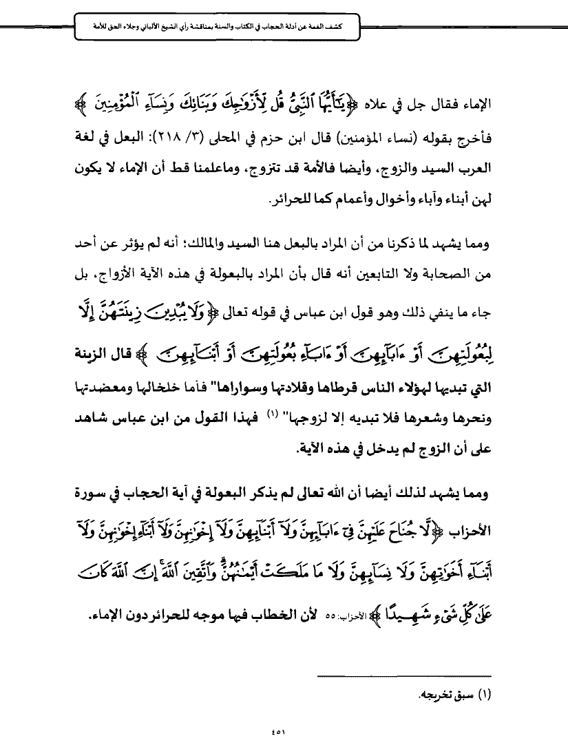 ومما يشهد لذلك أيضا أن الله تعالى لم يذكر البعولة في آية الحجاب في سورة الأحزاب {لَا جُنَاحَ عَلَيْهِنَّ فِي آبَائِهِنَّ وَلَا أَبْنَائِهِنَّ وَلَا إِخْوَانِهِنَّ وَلَا أَبْنَاءِ إِخْوَانِهِنَّ وَلَا أَبْنَاءِ أَخَوَاتِهِنَّ وَلَا نِسَائِهِنَّ وَلَا مَا مَلَكَتْ أَيْمَانُهُنَّ وَاتَّقِينَ اللَّهَ إِنَّ اللَّهَ كَانَ عَلَى كُلِّ شَيْءٍ شَهِيدًا} الأحزاب: ٥٥ ... لأن الخطاب فيها موجه للحرائر دون الإماء.