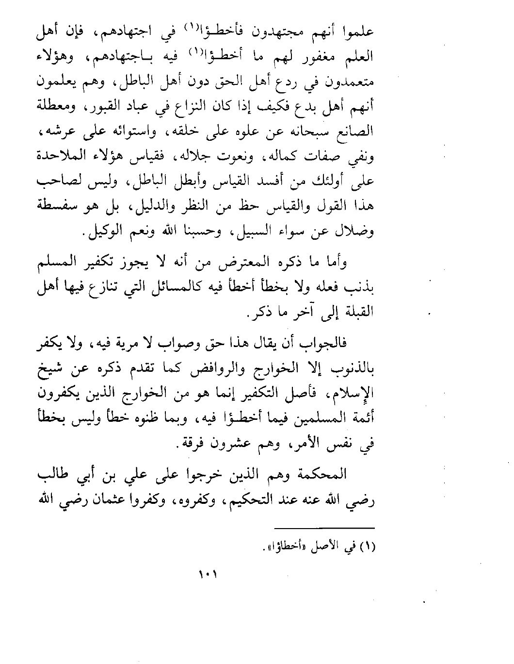 فالجواب أن يقال هذا حق وصواب لا مرية فيه، ولا يكفر بالذنوب إلا الخوارج والروافض كما تقدم ذكره عن شيخ الإسلام، فأصل التكفير إنما هو من الخوارج الذين يكفرون أئمة المسلمين فيما أخطؤوا فيه، وبما ظنوه خطأ وليس بخطأ في نفس الأمر، وهم عشرون فرقة.