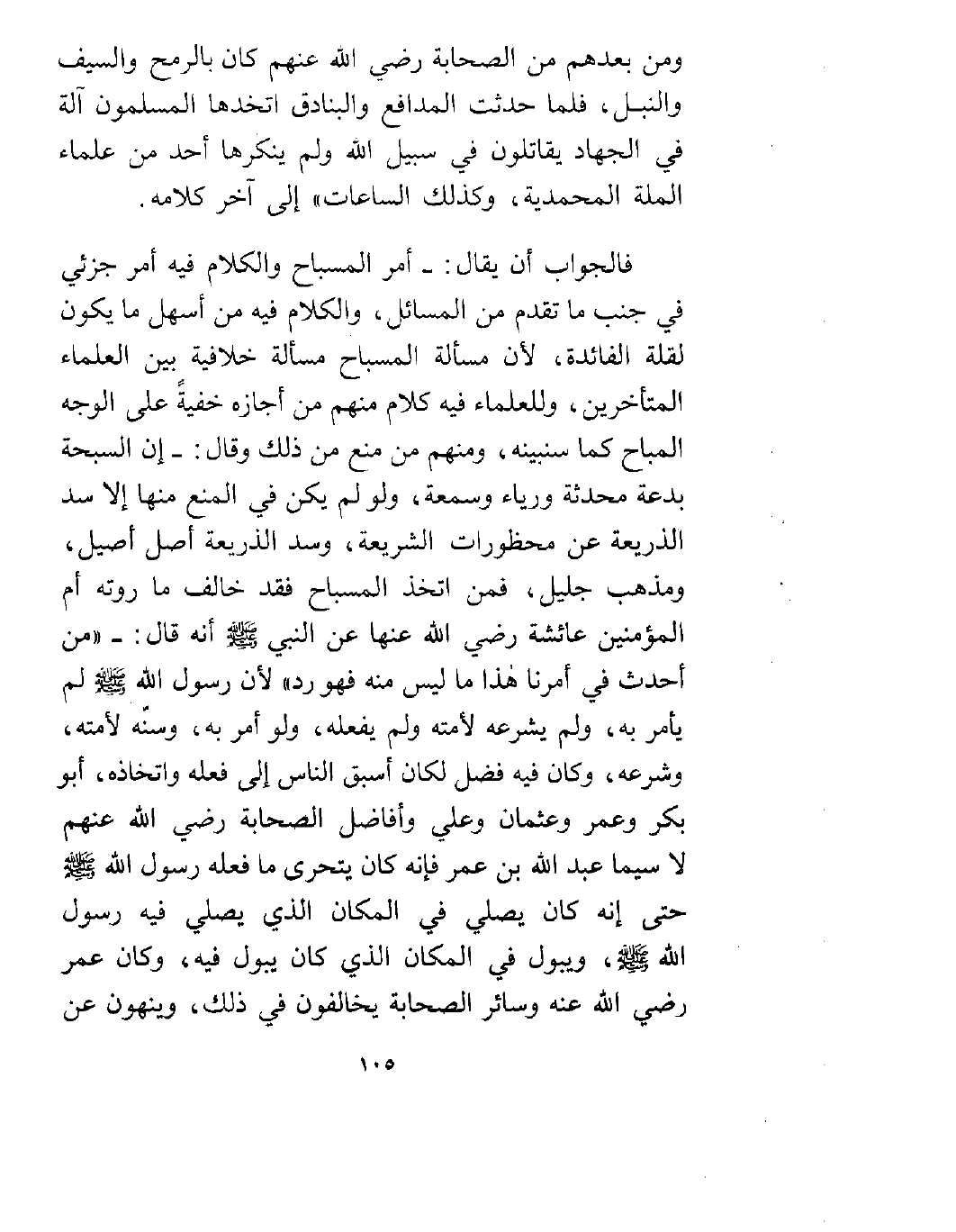 فالجواب أن يقال: أمر المسباح والكلام فيه أمر جزئي في جنب ما تقدم من المسائل، والكلام فيه من أسهل ما يكون لقلة الفائدة، لأن مسألة المسباح مسألة خلافية بين العلماء المتأخرين، وللعلماء فيه كلام منهم من أجازه خفيةً على الوجه المباح كما سنبينه، ومنهم من منع ذلك وقال: إن السبحة بدعة محدثة ورياء وسمعة، ولو لم يكن في المنع منها إلا سد الذريعة عن محظورات الشريعة، وسد الذريعة أصل أصيل، ومذهب جليل، فمن اتخذ المسباح فقد خالف ما روته أم المؤمنين عائشة رضي الله عنها عن النبي صلى الله عليه وسلم أنه قال: "من أحدث في أمرنا هذا ما ليس منه فهو رد" لأن رسول الله صلى الله عليه وسلم لم يأمر به ولم يشرعه لأمته لوم يفعله، ولو أمر به، وسنه لأمته، وشرعه، وكان فيه فضل لكان أسبق الناس إلى فعله واتخاذه، أبو بكر وعمر وعثمان وعلي وأفاضل الصحابة رضي الله عنهم لا سيما عبد الله بن عمر فإنه كان يتحرى ما فعله رسول الله صلى الله عليه وسلم حتى إنه كان يصلي في المكان الذي يصلي فيه رسول الله صلى الله عليه وسلم ويبول في المكان الذي كان يبول فيه، وكان عمر رضي الله عنه وسائر الصحابة يخالفون في ذلك، وينهون عن