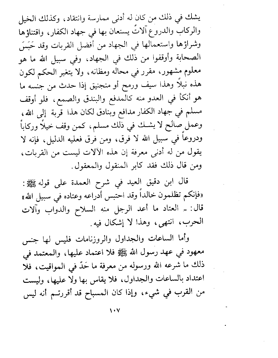 يشك في ذلك من كان له أدنى ممارسة وانتقاد، وكذلك الخيل والركاب والدروع آلاتٌ يستعان بها في جهاد الكفار، واقتناؤها وشراؤها واستعمالها في الجهاد من أفضل القربات وقد حَبَسَ الصحابة وأوقفوا من ذلك في الجهاد، وفي سبيل الله ما هو معلوم مشهور، مقرر في محاله ومظانه، ولا يتغير الحكم لكون هذه نبلاً وهذا سيف ورمح أو منجنيق إذا حدث من جنسه ما هو أنكأ في العدو منه كالمدفع والبندق والصمع، فلو أوقف مسلم في جهاد الكفار مدافع وبنادق لكان هذا قربة إلى الله، وعمل صالح لا يشك في ذلك مسلم، كمن وقف خيلاً وركاباًً ودروعاً في سبيل الله لا فرق، ومن فرق فعليه الدليل، فإنه لا يقول من له أدنى معرفة إن هذه الآلات ليست من القربات، ومن قال ذلك فقد كابر المنقول والمعقول.