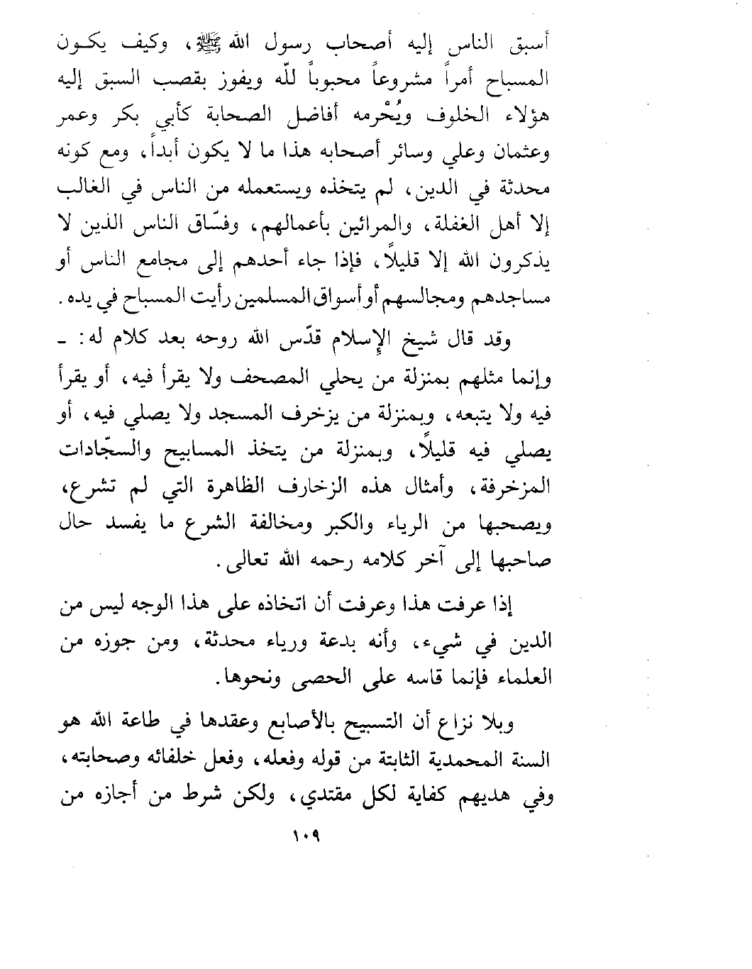 أسبق الناس إليه أصحاب رسول الله صلى الله عليه وسلم، وكيف يكون المسباح أمراً مشروعاً محبوباً لله ويفوز بقصب السبق إليه هؤلاء الخلوف ويُحرمه أفاضل الصحابة كأبي بكر وعمر وعثمان وعلي وسائر أصحابه _ رضي الله عنهم _ هذا ما لا يكون أبداً، ومع كونه محدثة في الدين، لم يتخذه ويستعمله من الناس في الغالب إلا أهل الغفلة، والمرائين بأعمالهم، وفساق الناس الذين لا يذكرون الله إلا قليلاً، فإذا جاء أحدهم إلى مجامع الناس أو مساجدهم ومجالسهم أو أسواق المسلمين رأيت المسباح في يده.