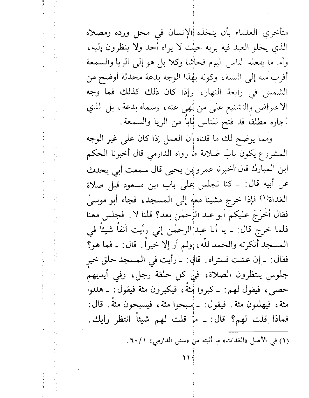 ومما يوضح لك ما نقلناه أن العمل إذا كان على غير الوجه المشروع يكون بابَ ضلالة ما رواه الدارمي قال أخبرنا الحكم عن ابن المبارك قال أخبرنا عمرو بن يحيى قال سمعت أبي يحدث عن أبيه قال: كما نجلس على باب ابن مسعود قبل صلاة الغداة1 فإذا خرج مشينا معه إلى المسجد، فجاء أبو موسى فقال: أَخَرَجَ عليك أبو عبد الرحمن بعد؟ قلنا: لا. فجلس معنا فلما خرج قال: يا أبا عبد الرحمن إني رأيت آنفاً شيئاً في المسجد أنكرته والحمد لله، ولم أر إلا خيراً. قال: فما هو؟ فقال: إن عشت فستراه. قال: رأيت في المسجد حلق خيرٍ جلوس ينتظرون الصلاة، في كل حلقة رجل، وفي أيديهم حصى، فيقول لهم: كبروا مائة، فيكبرون مائة فيقول: هللوا مائة، فيهللون مائة،.فيقول: سبحوا مائة، فيسبحون مائة. قال: فماذا قلت لهم؟ قال: ما قلت لهم شيئاًَ انتظر رأيك.