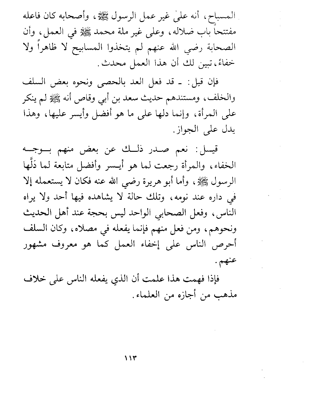 المسباح أنه على غير عمل الرسول صلى الله عليه وسلم، وأصحابه كان فاعله مفتتحاً باب ضلاله، وعلى غير ملة محمد صلى الله عليه وسلم في العمل، وأن الصحابة رضي الله عنهم لم يتخذوا المسابيح لا ظاهراً ولا خفاءً، تبين لك أن هذا العمل محدث.