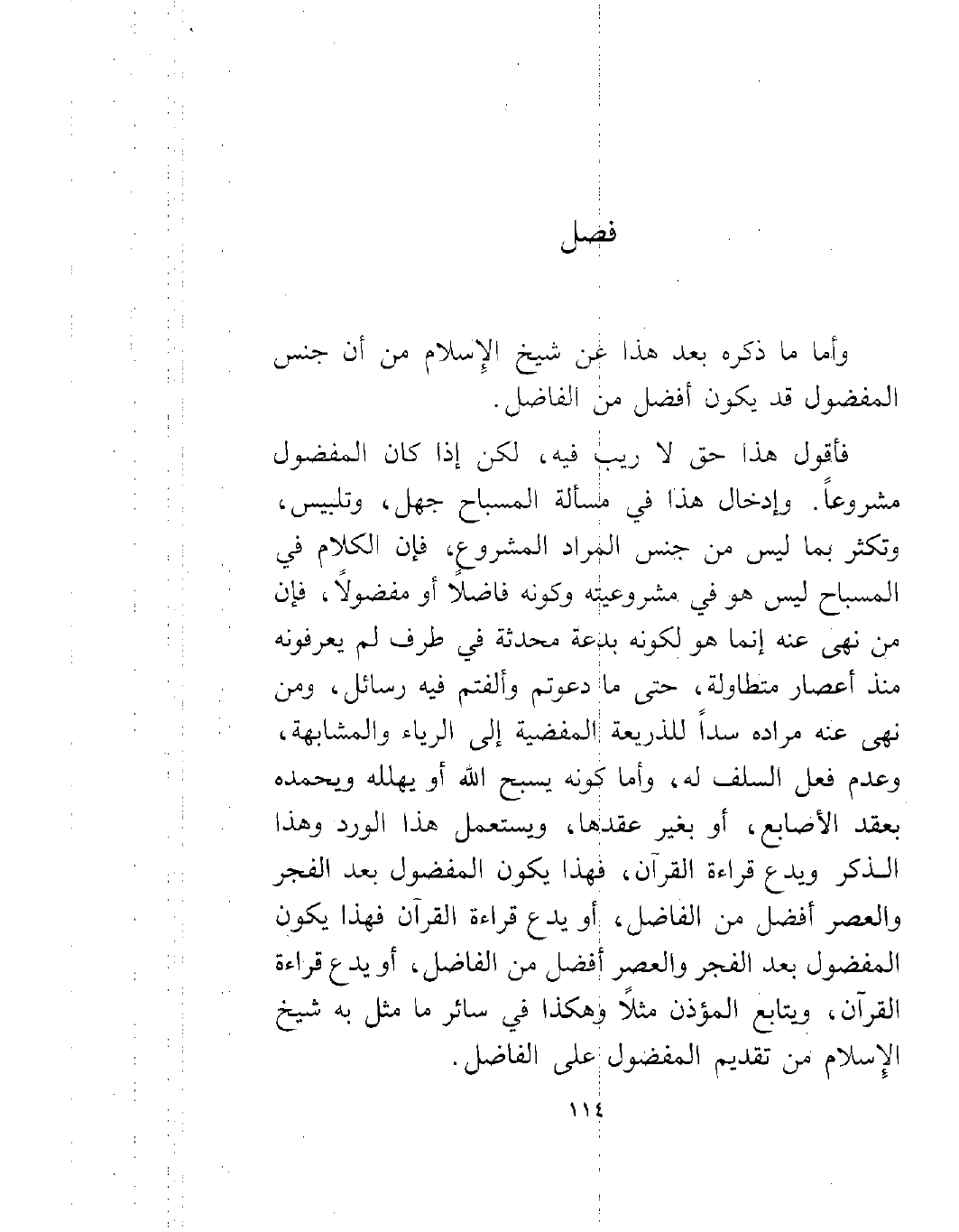 فأقول: هذا حق لا ريب فيه، لكن إذا كان المفضول مشروعاً وإدخال هذا في مسألة المسباح جهل، وتلبيس، وتكثر بما ليس هو في مشروعيته وكونه فاضلاً أو مفضولاً، فإن من نهى عنه إنما هو لكونه بدعة محدثة في طرف لم يعرفونه منذ أعصار متطاولة، حتى ما دعوتم وألفتم في رسائل، ومن نهى عن مراده سداً للذريعة المفضية إلى الرياء والمشابهة، وعدم فعل السلف له، وأما كونه يسبح الله أو يهلله ويحمده بعقد الأصابع، أو بغير عقدها، ويستعمل هذا الورد وهذا الذكر ويدع قراءة القرآن فهذا يكون المفضول بعد الفجر والعصر أفضل من الفاضل، أو يدع قراءة القرآن، ويتابع المؤذن مثلاً وهكذا في سائر ما مثل به شيخ الإسلام من تقديم المفضول على الفاضل.