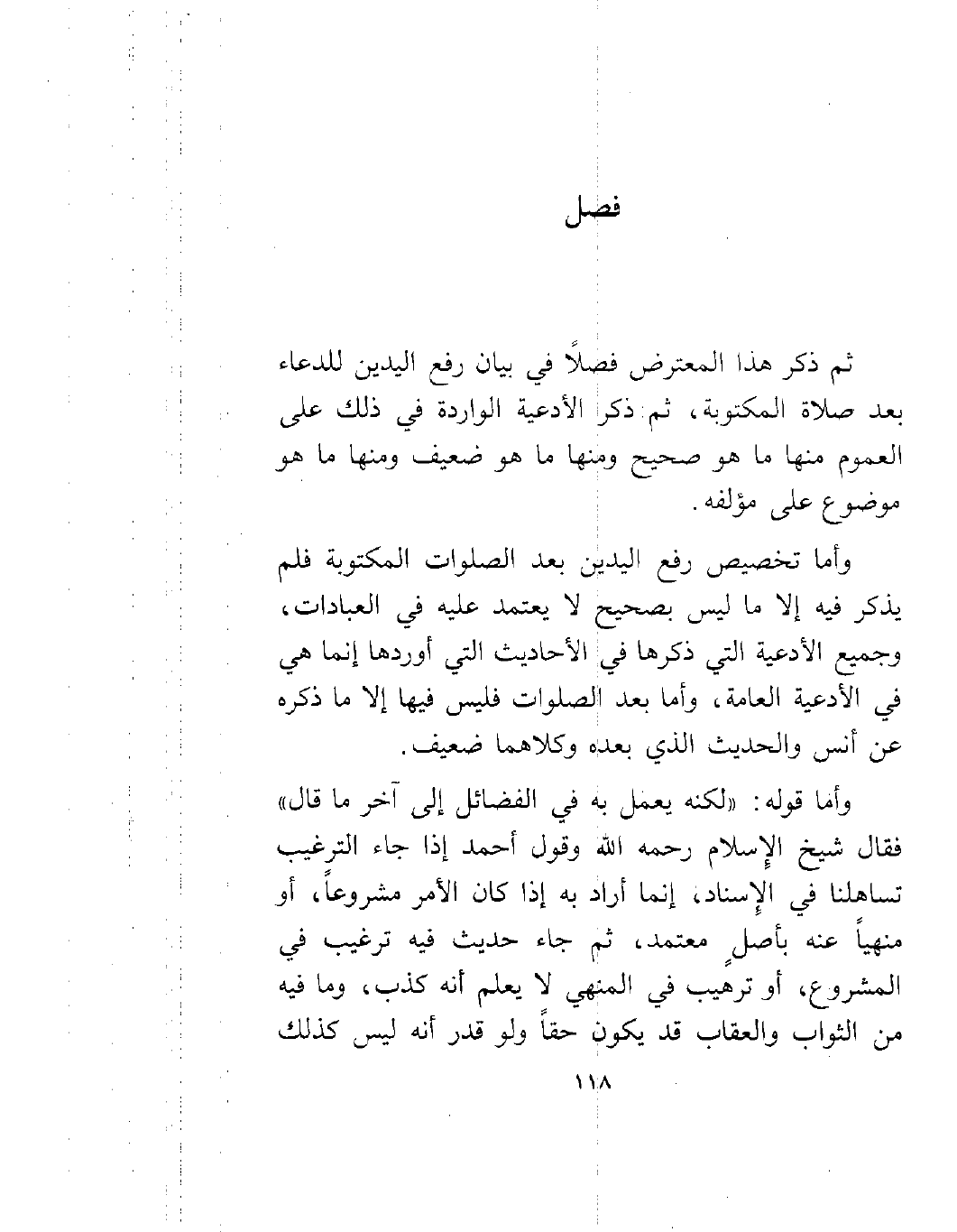 وأما تخصيص رفع اليدين بعد الصلوات المكتوبة فلم يذكر فيه إلا ما ليس بصحيح لا يعتمد عليه في العبادات وجميع الأدعية التي ذكرها في الأحاديث التي أوردها إنما هي في الأدعية العامة، وأما بعد الصلوات فليس فيها إلا ما ذكره عن أنس والحديث الذي ذكره بعده وكلاهما ضعيف.